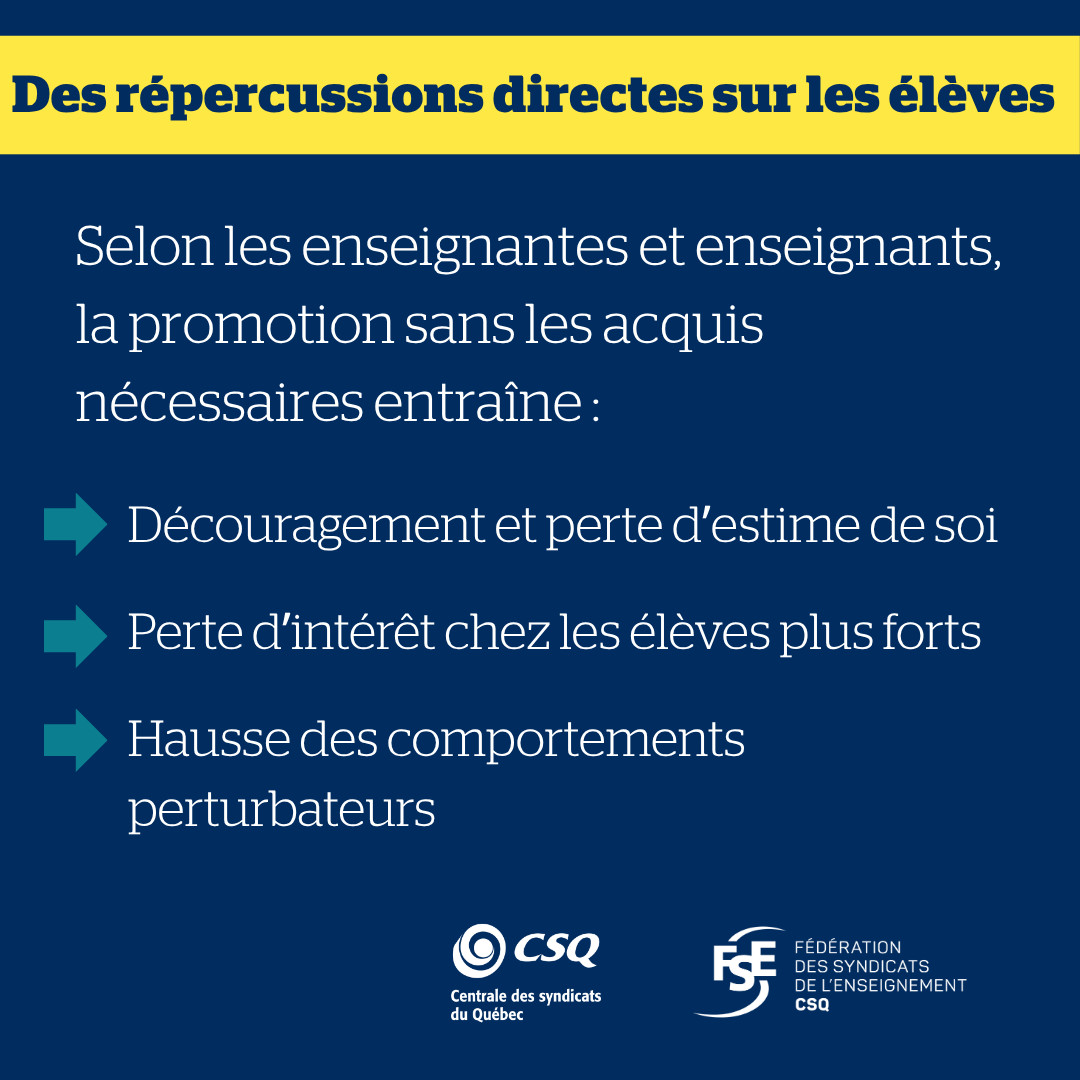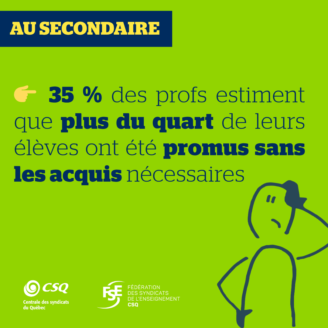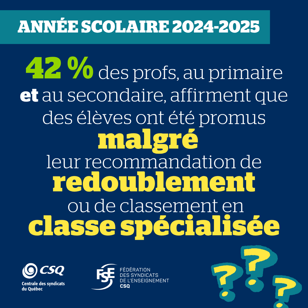 « Ces résultats inquiétants démontrent hors de tout doute que la promotion des élèves sans les acquis est une problématique majeure du réseau qui ne peut plus être ignorée. Beaucoup d’élèves dans les classes n’ont ni le niveau attendu ni une maîtrise suffisante des notions préalables, ce qui a un impact direct sur la charge de travail des profs et sur les services aux autres élèves. Il est plus que temps de donner un sérieux coup de barre, car faire passer les élèves au niveau supérieur sans s’assurer que la matière soit comprise et maitrisée, ça fait de belles statistiques à court terme, mais ça peut compromettre le parcours scolaire de bien des élèves », a fait savoir Richard Bergevin, président de la FSE‑CSQ.