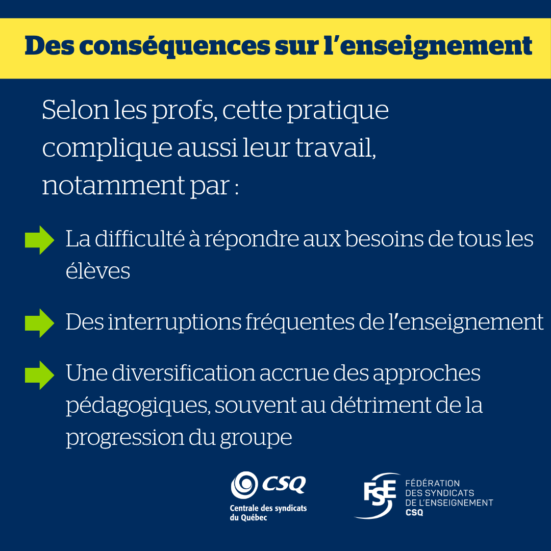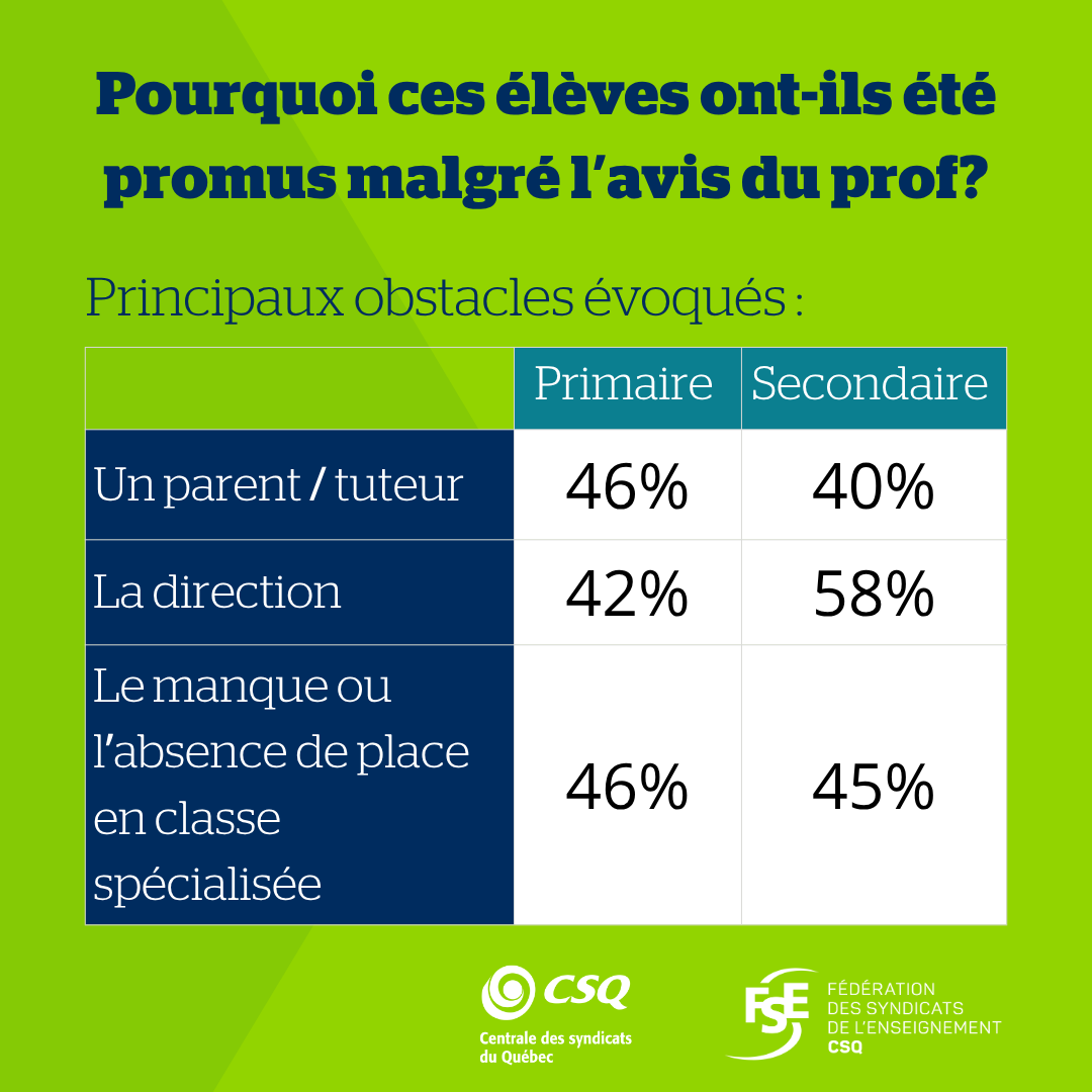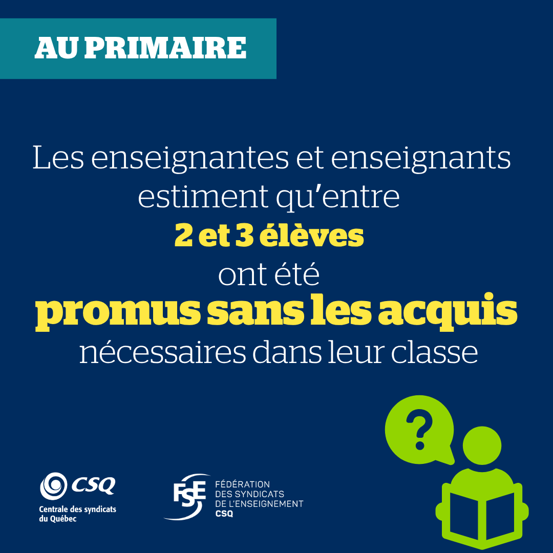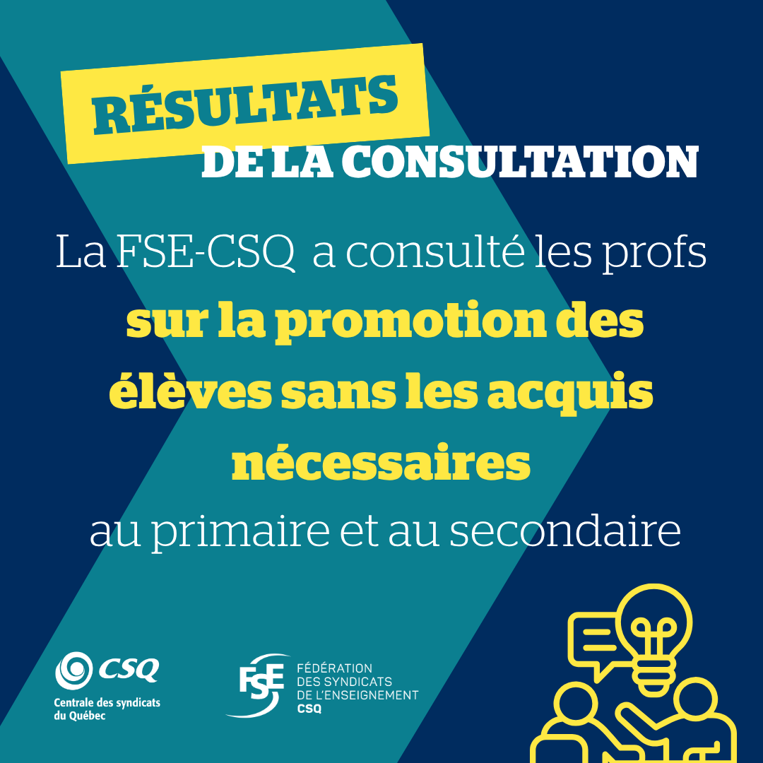 « Ces résultats inquiétants démontrent hors de tout doute que la promotion des élèves sans les acquis est une problématique majeure du réseau qui ne peut plus être ignorée. Beaucoup d’élèves dans les classes n’ont ni le niveau attendu ni une maîtrise suffisante des notions préalables, ce qui a un impact direct sur la charge de travail des profs et sur les services aux autres élèves. Il est plus que temps de donner un sérieux coup de barre, car faire passer les élèves au niveau supérieur sans s’assurer que la matière soit comprise et maitrisée, ça fait de belles statistiques à court terme, mais ça peut compromettre le parcours scolaire de bien des élèves », a fait savoir Richard Bergevin, président de la FSE‑CSQ.