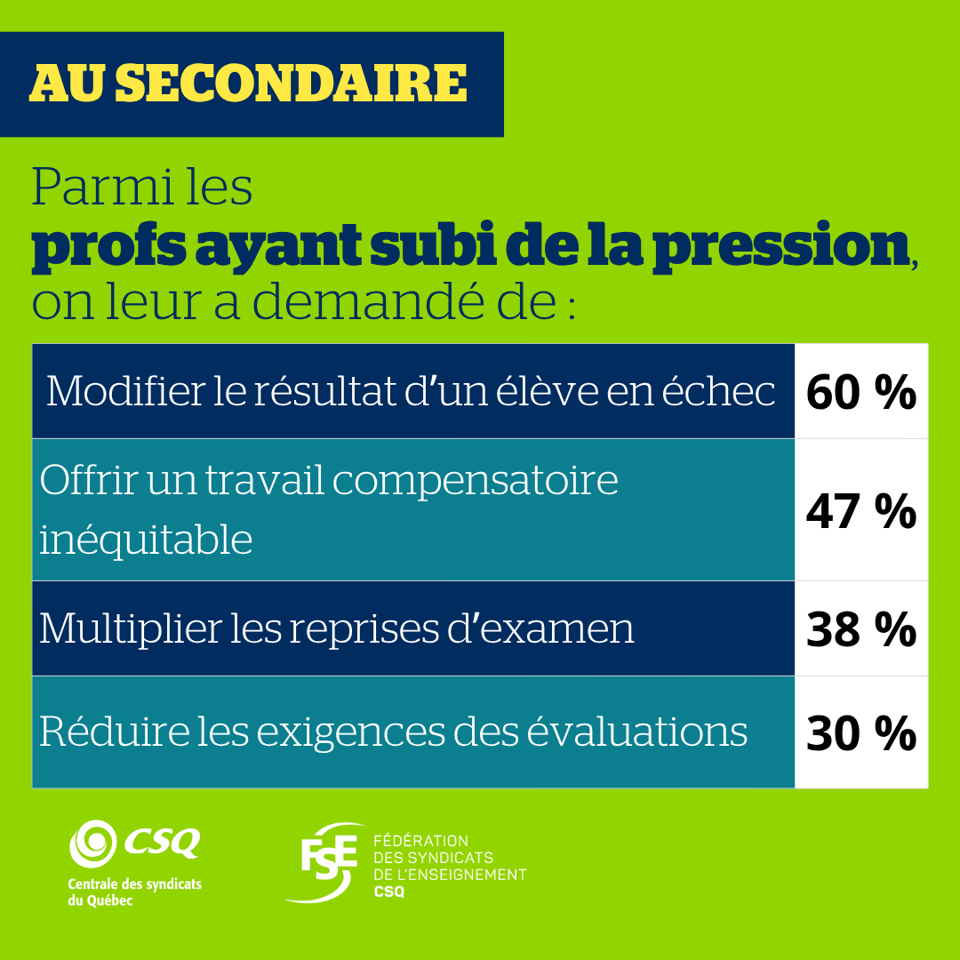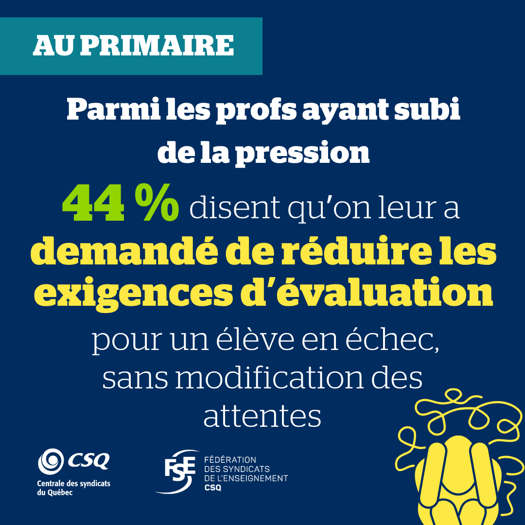 Parmi ceux ayant subi de la pression, 44 % des profs du primaire affirment qu’on leur a demandé de réduire les exigences d’évaluation. Au secondaire, on a demandé aux profs ayant subi des pressions de modifier le résultat d’un élève en échec (60 %), ou de lui offrir un travail compensatoire inéquitable (47 %). La LIP (article 19.1) prévoit pourtant que l’attribution des notes appartient aux enseignants.