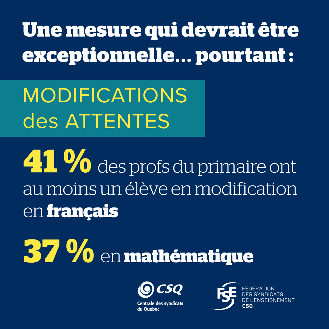 - 41 % des enseignants au primaire ont au moins un élève en modification des attentes en français dans leur classe; 37 % en ont au moins un en mathématique. Rappelons que la modification des attentes devrait être une mesure exceptionnelle pour les élèves qui ne peuvent répondre aux exigences du programme.