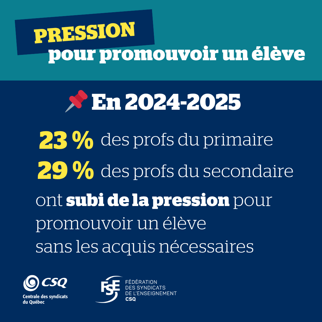 - 23 % des profs du primaire et 29 % des profs du secondaire ont affirmé avoir subi des pressions pour promouvoir un élève;